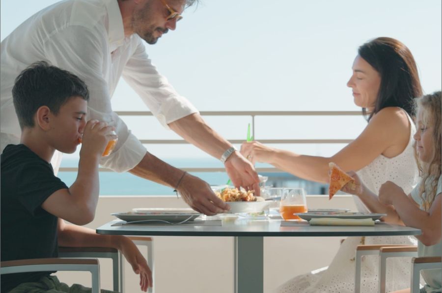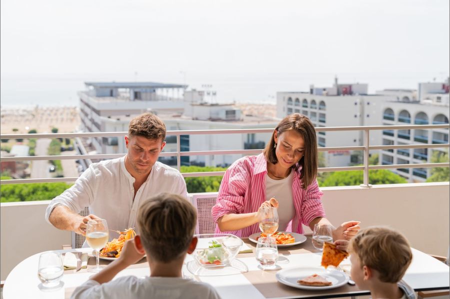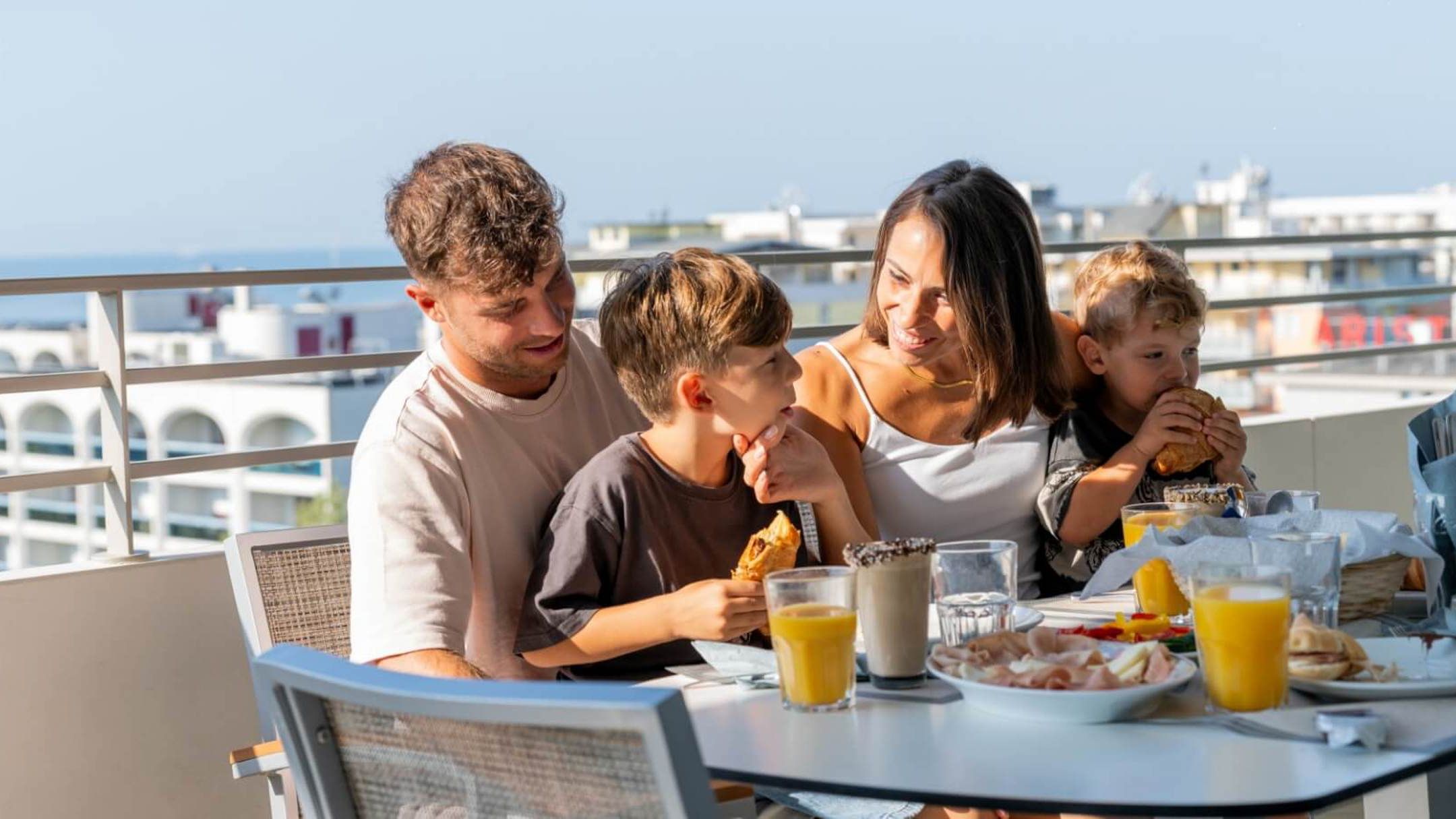 Die Terrasse ist das wahre Highlight der Suite: 23 m² überdachte, nach Süden ausgerichtete Terrasse, ausgestattet für die ganze Familie. Sie umfasst einen Tisch für sechs Personen für Mahlzeiten mit Panoramablick, zwei Sonnenliegen für private Entspannungsmomente und einen praktischen geschlossenen Abstellraum. Der Meerblick begleitet jeden Moment des Tages, vom Frühstück bis zum Sonnenuntergang.