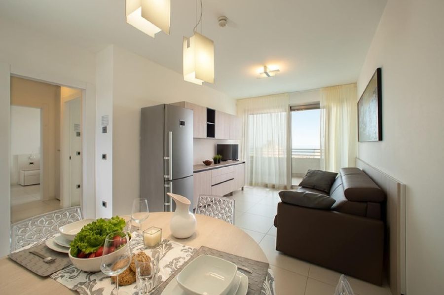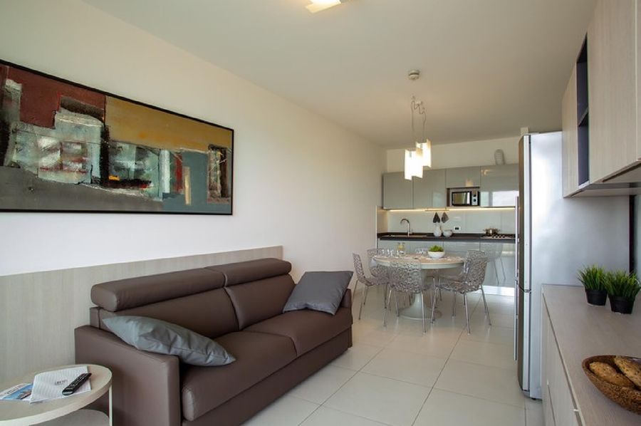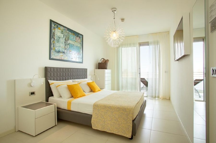 Die Deluxe Sea View Suite ist das geräumigste und exklusivste Apartment der Residence: 83 m² mit direktem Panoramablick auf das Meer, zwei vollständige Badezimmer, eine 23 m² große Terrasse. Die ideale Lösung für alle, die auf nichts verzichten möchten.