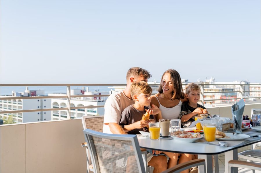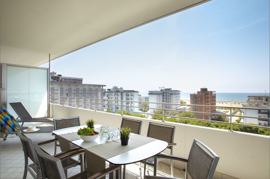 Diese Suite befindet sich vom sechsten bis zum achten Stock und bietet einen Panoramablick auf das Meer, der alle Räume des Wohnbereichs natürlich erhellt. Im Gegensatz zu den anderen Apartments finden Sie hier zwei vollständige Badezimmer mit einem privaten en-suite Badezimmer im Doppelzimmer. Zusätzlich verfügt sie über eine große 23 m² Terrasse, ausgestattet mit Sonnenliegen. Vollständig schallisoliert und mit täglicher Reinigung inklusive, bietet sie bequem Platz für bis zu 7 Personen auf den großzügigen 83 m² der Residence, auch ideal für längere Aufenthalte.